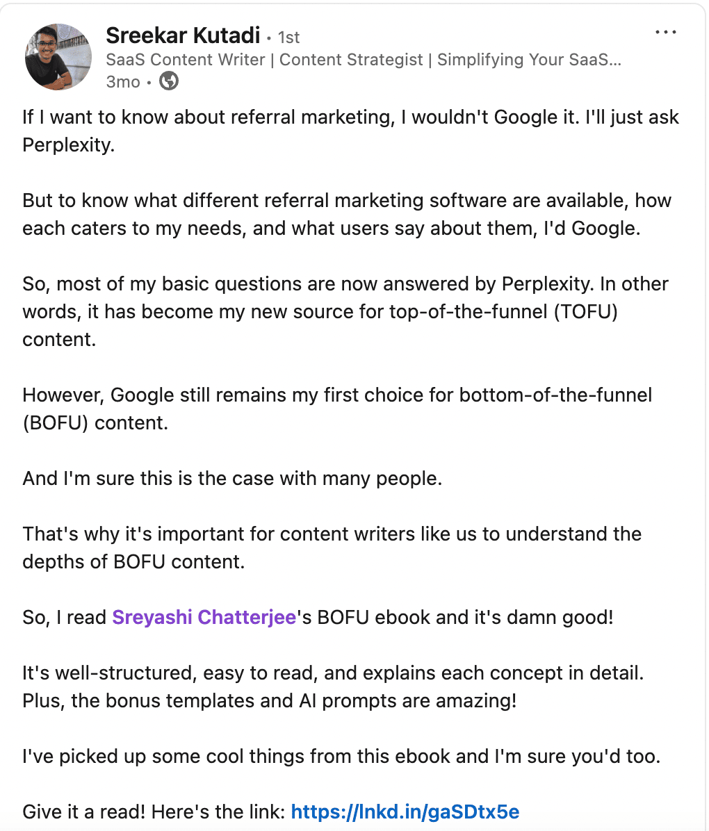 The exact prompts and workflows helped me generate over five organic leads in my current organization, where I am the only content marketer, within the first quarter.