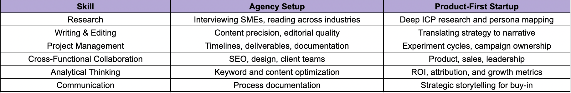 That autonomy accelerates growth — but it also comes with accountability. When a strategy flops or a campaign fails, there’s no “team” to absorb it. It’s your call, your experiment, your lesson. You’ll also need to learn how to communicate in a bulletproof way — Another nuance: startups make you an industry insider very quickly. But that also means you can become industry-dependent. So while agencies make you multi-industry versatile, startups make you domain-deep. Which skills to sharpen up in both setups: Agency vs. product startup🏢 In an Agency