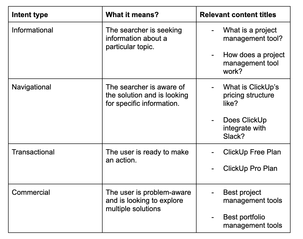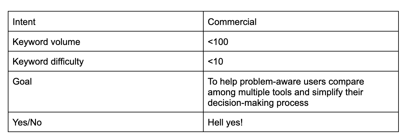 📚Note: Transactional and navigational keywords often overlap as the target users for both solution types are aware. But what might vary is to what extent they are aware of the solution. A user with navigational intent is still gaining information about specific features, integrations, etc., while a transactional user is much more specific and ready to purchase. Here’s an intent vs. content type distribution 👇 Read my LinkedIn post on this So, now the question is, how do you pick up a topic? Well, use this table 👇 If intent matches and keyword difficulty is less, go for the topic despite its low search volume. It is even better to pick long-tail keywords/questions/phrases if they are highly relevant to your audience. A quick SEMRush tutorial on domain research 👇