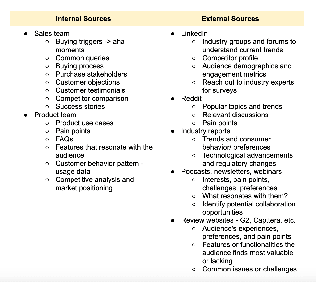 For this part, I am collaborating with Tripti Garg. I have worked with her before and learned much about research and building narratives. Doesn’t matter if you are a content marketer or writer, your audience research skills have to be strong. More so when you have minimal resources available. That’s precisely what Tripti has covered here. Say Hi to her on Linkedin 👋 While big companies spend millions of dollars on audience research, you don't necessarily need similar tools or a big team to gain valuable insights. So, today, I will cover the sources that are free and accessible. I have categorized them into — internal and external sources. Note: It can be difficult to access internal resources each time. So, if you find yourself having to work on your own, don’t worry. External resources, standalone, provide much information to get you started. And now comes the tricky part — converting all this information into meaningful insights. You wouldn’t want to spend hours researching and be left with a bunch of information that is hard to process and leaves you more confused. So, here is my three-bucket approach that you can use to easily organize all this information. You have three categories — current processes, pain points, and aha moments, and each piece of information is categorized into these buckets. Let’s See This In Action!Suppose you have the following information: ⚪️ Customer feedback highlights dissatisfaction with the lengthy process of setting up investment accounts. Users want a more streamlined onboarding experience and express interest in advanced portfolio management tools. ⚪️ Data analysis reveals that articles and tutorials on advanced investment strategies and portfolio diversification have the highest engagement. ⚪️ A competitor recently launched a mobile app update that simplifies the account opening process and integrates AI-driven portfolio optimization tools, increasing user satisfaction and adoption rates. Now, by applying the three-bucket approach: 🟢 Current Processes Users struggle during the account setup process, which involves multiple steps and requires manual data input. This discourages potential users and hinders market expansion. 🟢 Pain Points The cumbersome onboarding process impacts user engagement and acquisition, leading to a loss of market share. 🟢 AHA Moments